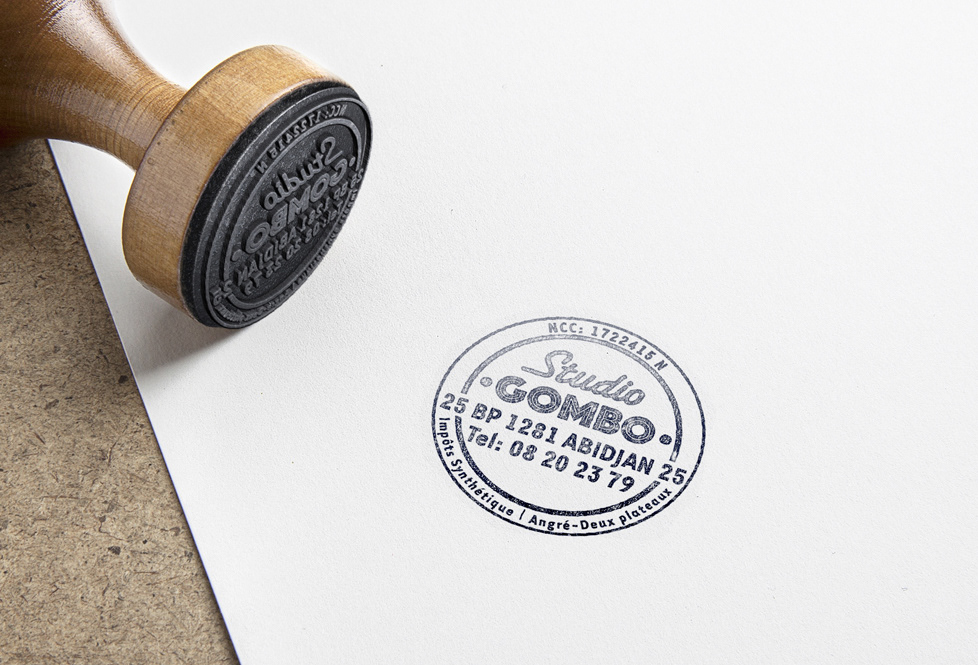 Création du logo, des cartes de visite et tampon du Studio Gombo à Abidjan. Studio Gombo, Abidjan, Côte d’Ivoire, 2017 - 2018.